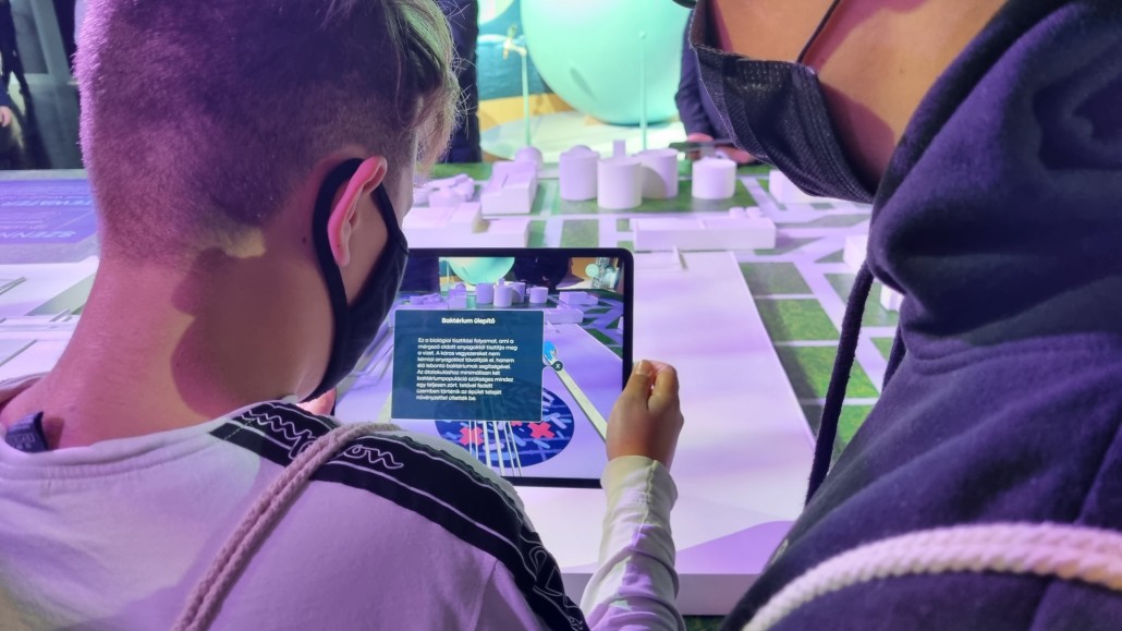 The Planet Budapest Sustainable Expo was held at the beginning of December 2021 at Hungexpo, the fair site of the Hungarian capital. The purpose of the event was to raise the attention of the adverse effects of our environmental, social and economical activity and show that these negative trends, risking the future of Earth are still reversible. We’ve developed VR and AR solutions to help visitors – especially the younger generations who really expected new technologies – to understand the trends, symptoms and what can be done to avoid a bad outcome. One of our immersive interactive visualization application was an AR one running on iPad Pro’s and adding 3D explanatory animations to a scale model of a water treatment facility. The app brought to life the 2m*3m replica of the Csepel facility adding content showing how the process actually working – so besides the static physical object visitors met with a dynamic digital content inviting them to explore each and every part of the scale model Six iPad Pro’s was installed around the model, all placed in a security cradle which managed the continuous charging of the devices, too. The app was using marker based AR – to makes sure the content is really accurately placed on the targeted surfaces – so the markerprints were stick to the scale model. The content included animated incoming sewage and outgoing water pipes, purifying and cleaning machines all accompanied with explanations in pop up windows – all appearing at the exact spot it is happening in real life. These parts could be done in the static 3D printed scale model – but could be easily added with Augmented Reality. The app was a good example on how a regular and well know exhibition solution could be adapted to the needs of the visitors today.